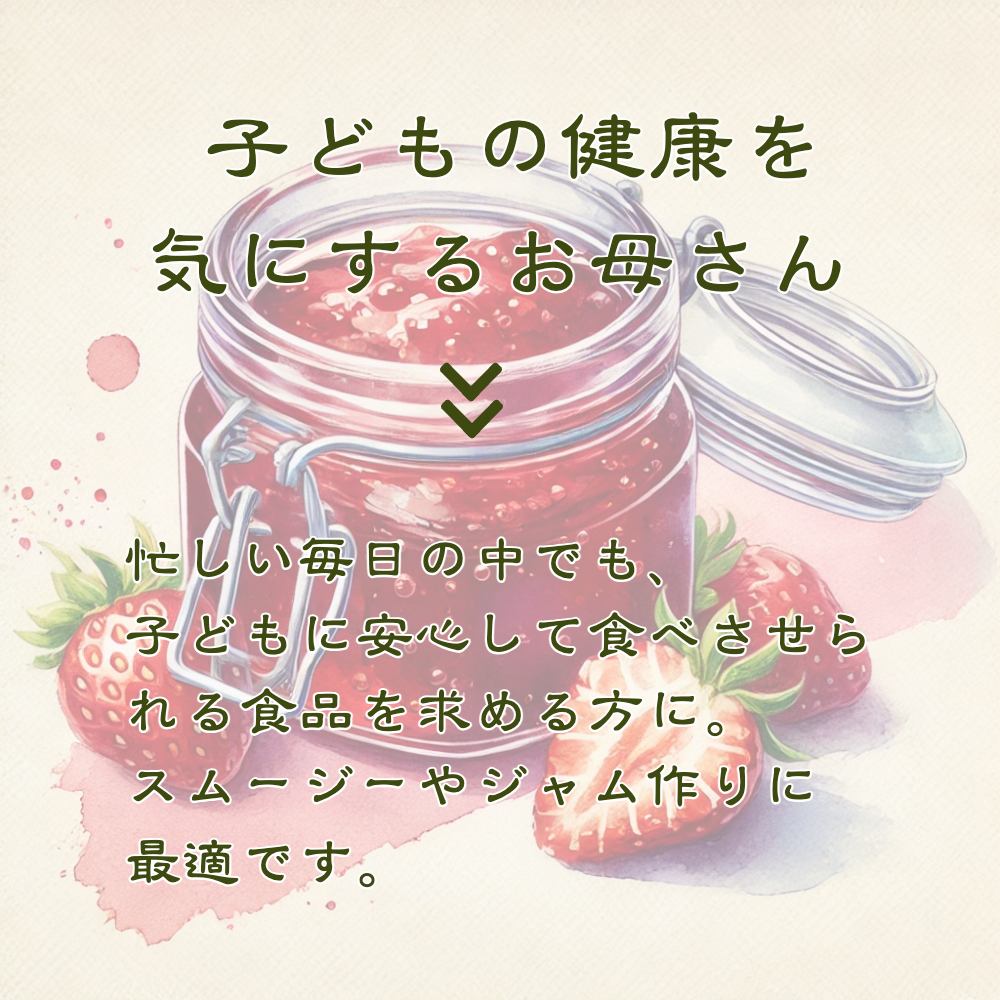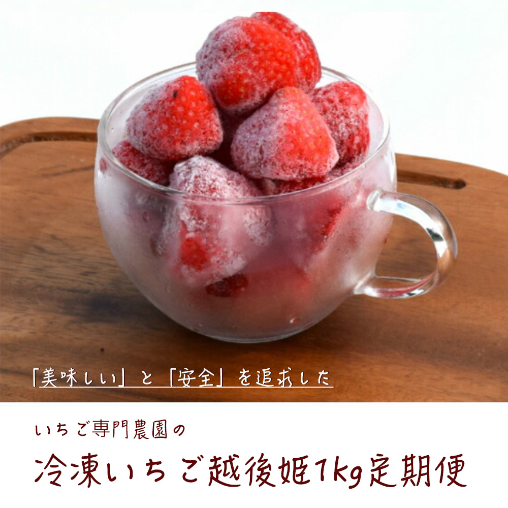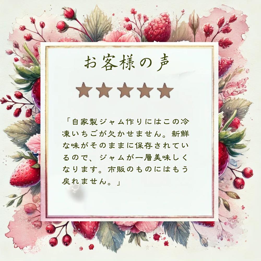 A: 冷凍いちご越後姫 【原材料】いちご 新潟県産(苺の花ことば産) 【内容量】1000g 【成分表記】100gあたり熱量31kcal/蛋白質0.9g/脂質0.1g/炭水化物8.5g/食塩相当量0g(推定値)