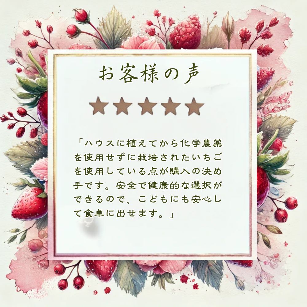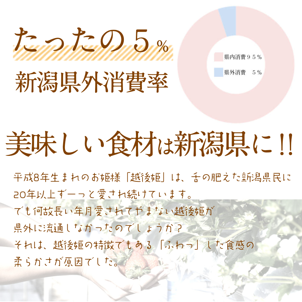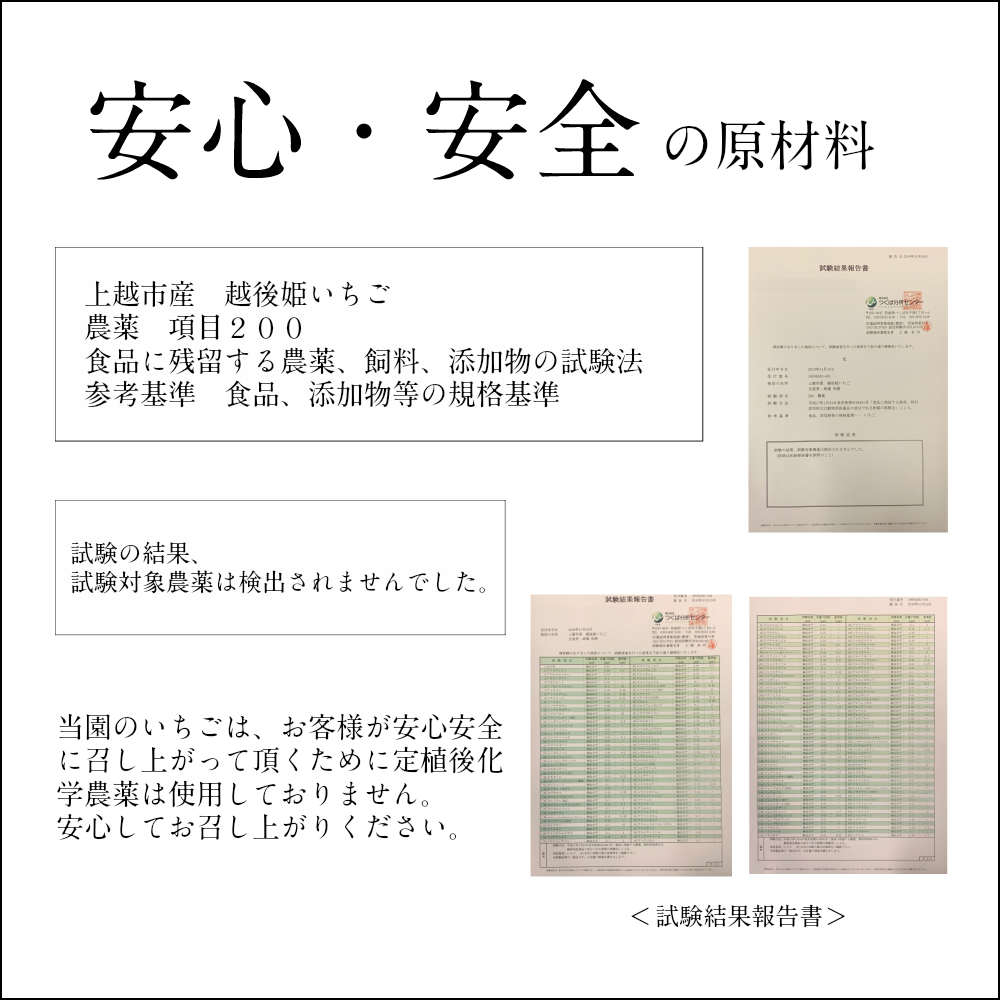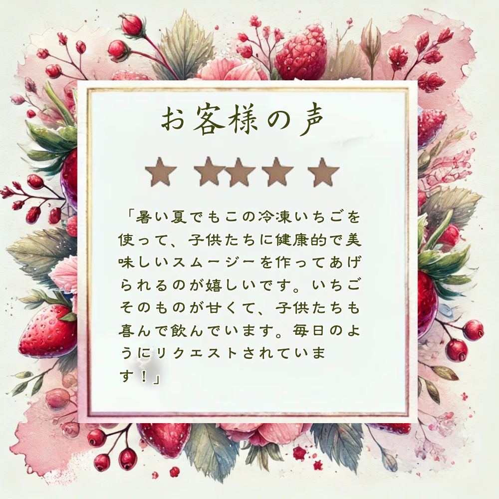 A: 冷凍いちご越後姫 【原材料】いちご 新潟県産(苺の花ことば産) 【内容量】1000g 【成分表記】100gあたり熱量31kcal/蛋白質0.9g/脂質0.1g/炭水化物8.5g/食塩相当量0g(推定値)